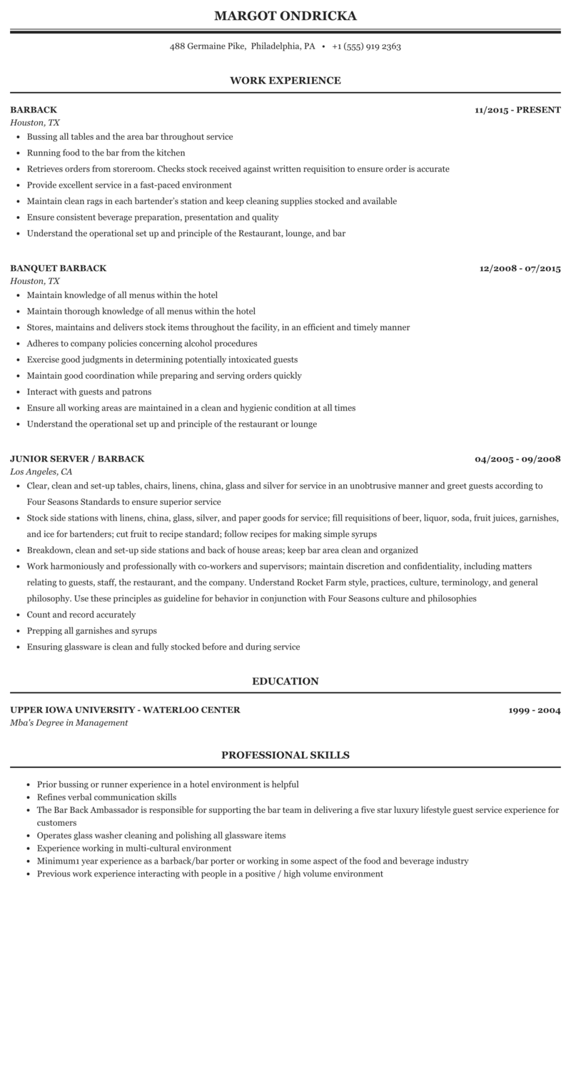 These bartending resume tips will get you to the top of the pile. Reasons to put military experience on a resume. Whether you're a career changer or a new grad with no internships under your belt, what can you actually p. Looking to land your next bartending gig? You literally have zero relevant work experience. A resume is a formal document created and used by a person to show their career background and skills. How to summarize work experiences on resumes after long absences. Resumes are an important tool in any job search, and they can make or break you as a candidate. Whether you're applying for a new role, angling for a promotion or submitting a competition application, the right resume can either. This may seem like a lot of pressure, but getting the right format for a resume is easier than it seems at first. When seeking to further a career in the service industry, you should understand how to highlight relevant. But what if you don't have any job experience? In episode 2 of how to get a job, host mitra jouhari fills us in on the finer points of updating your résumé.